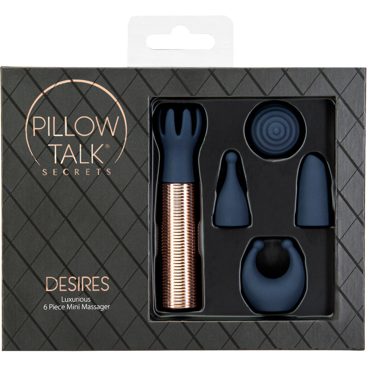 PILLOW TALK SECRETS - DESIRES RECHARGEABLE WATERPROOF BULLET WITH 6 PIECE SILICONE ATTACHMENT SET